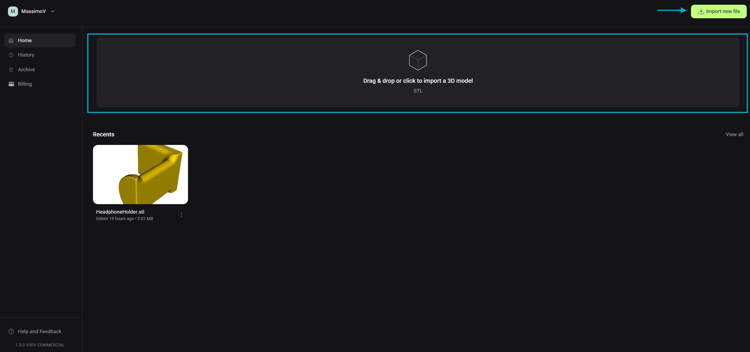 - From the Home Page, click “Drag & drop or click to import a 3D model” or use the “Import new file” button in the upper right.