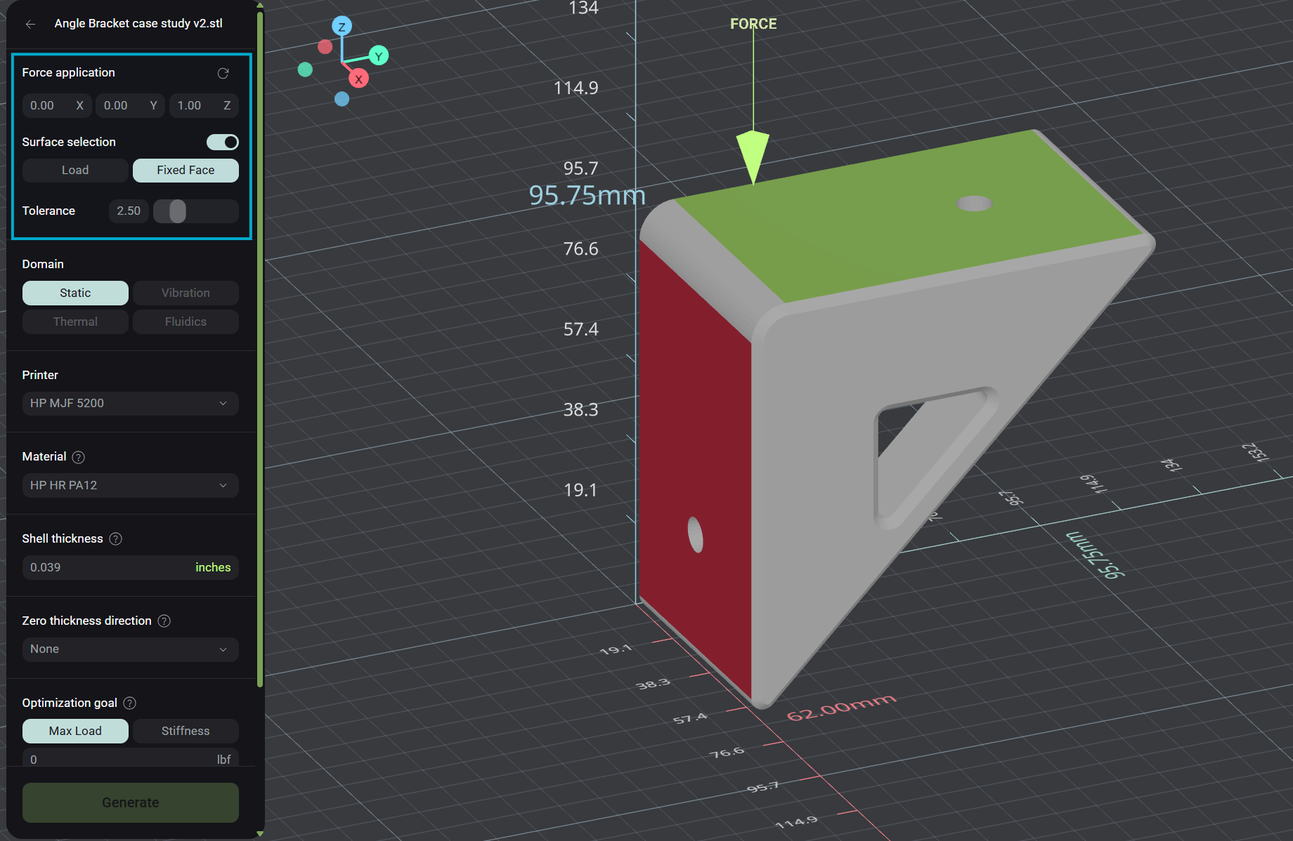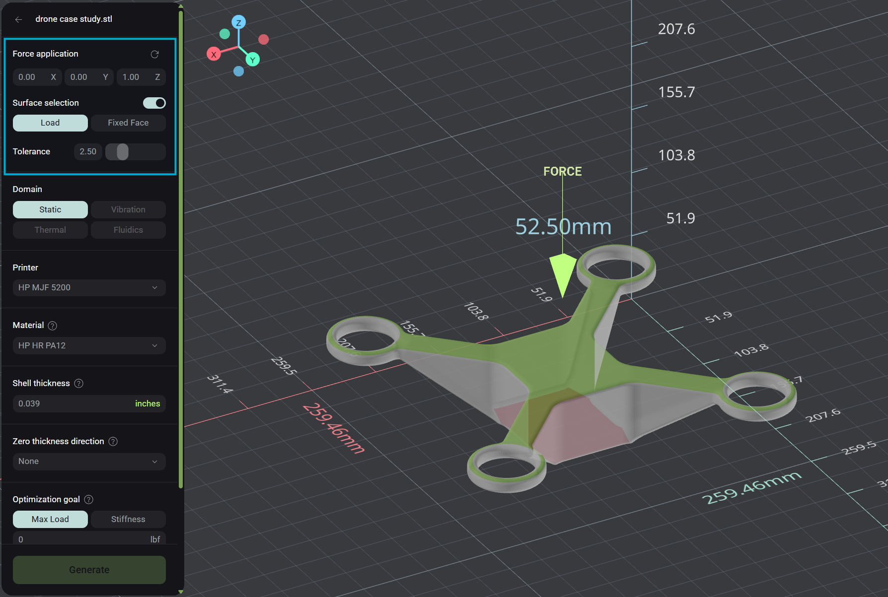 - Optimization Goal: Optimize for Max Load or Stiffness.