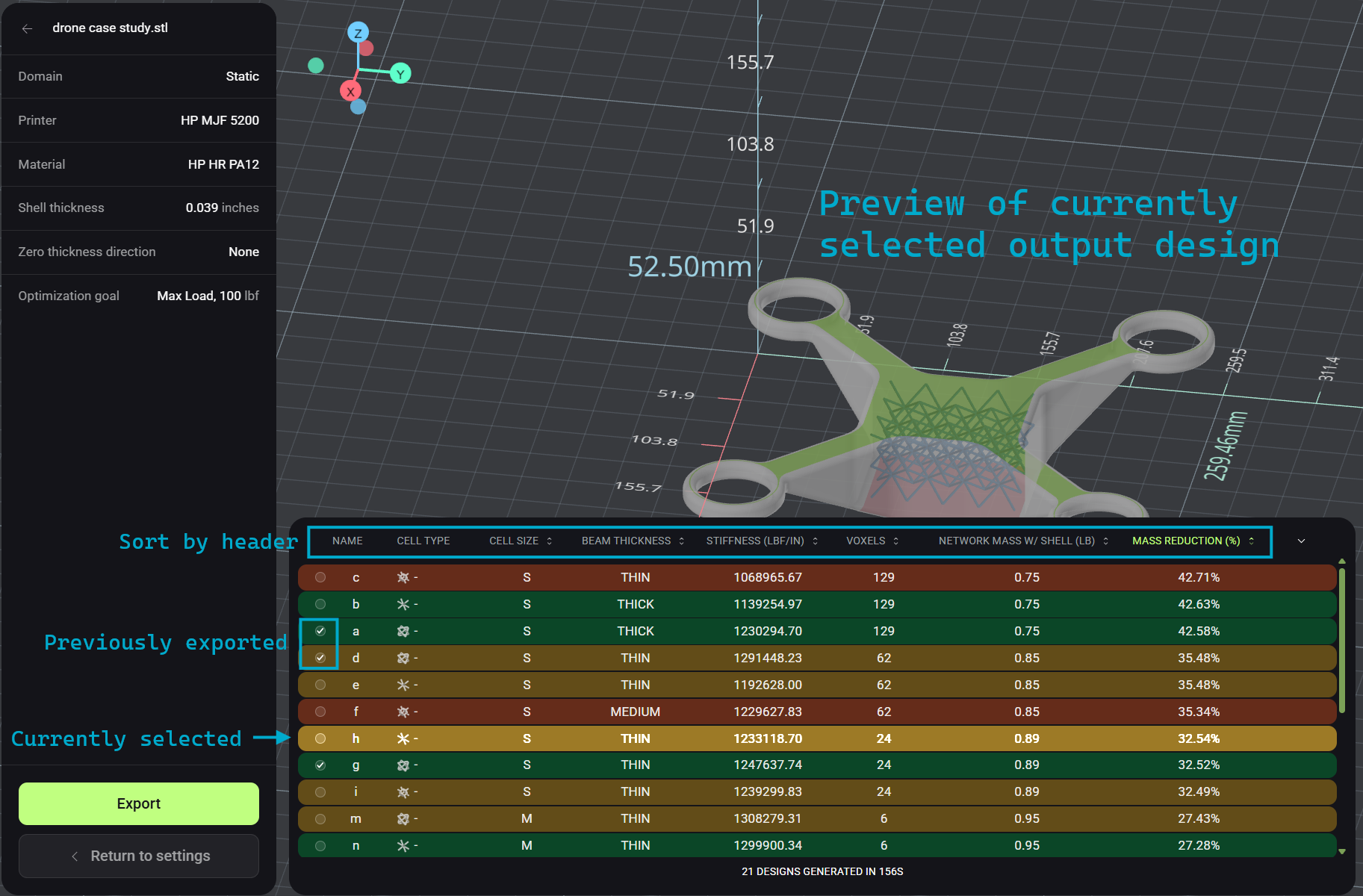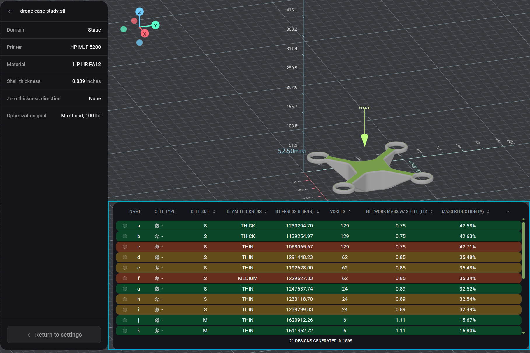 - Sort designs by your priorities (mass reduction, stiffness, etc.)